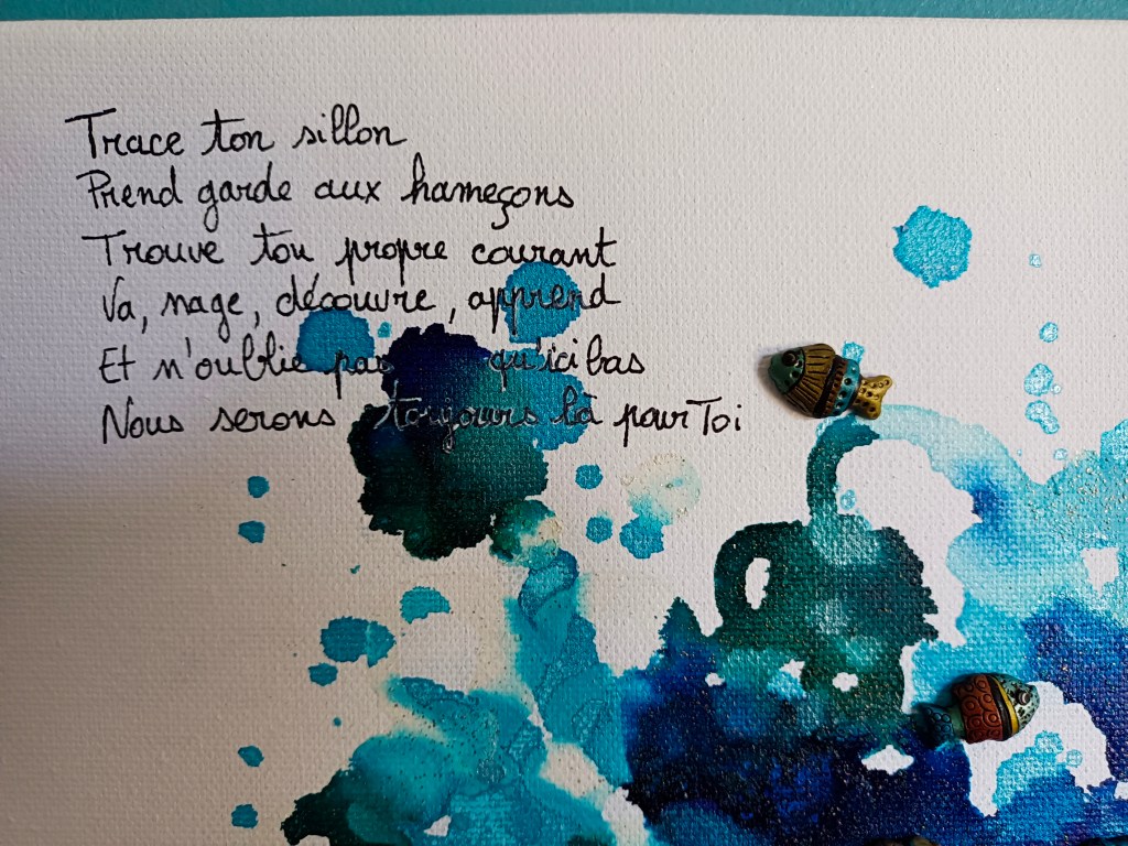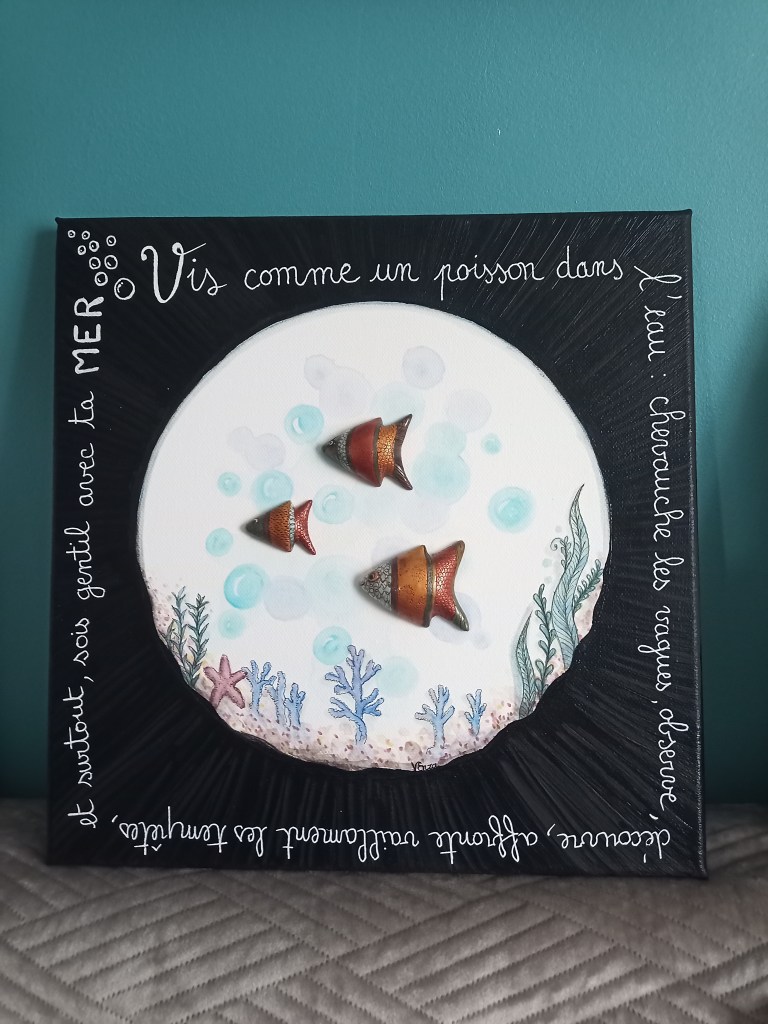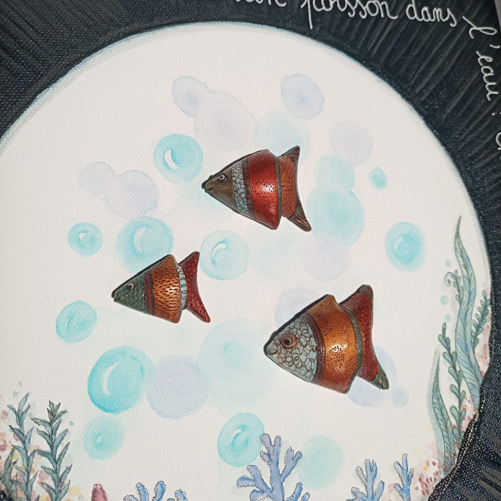 Poissons modelés selon technique de perle creuse, gravés, patinés, mis en scène sur fonds peint (acrylique et aquarelle) – Toile sur chassis 20*20cm
