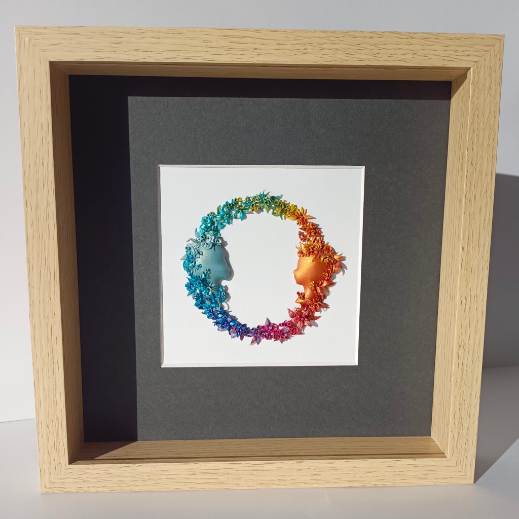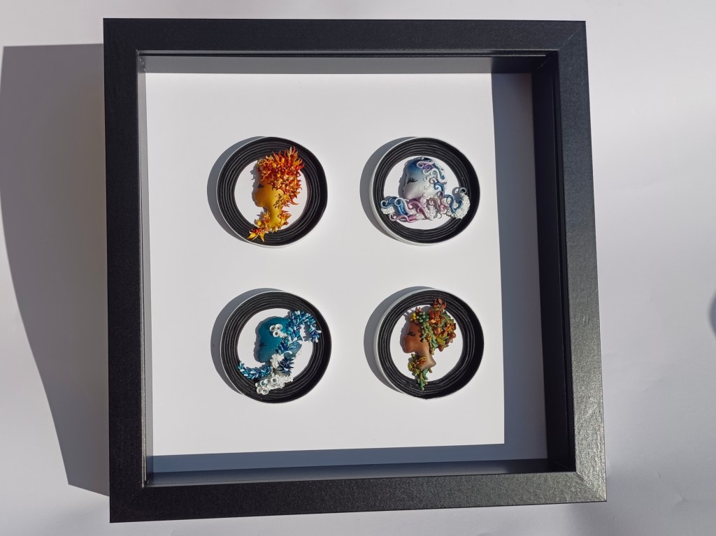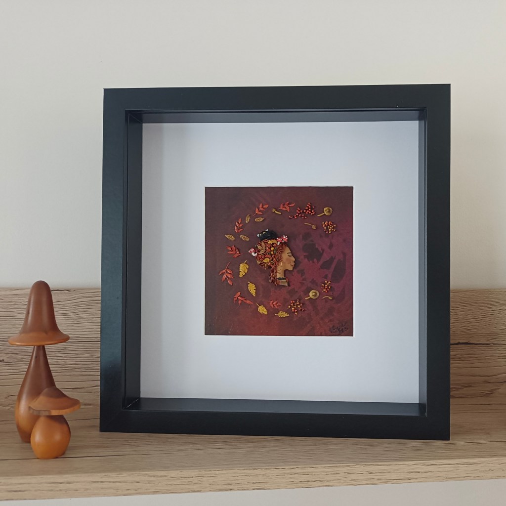 L’œuvre finale est présentée dans un cadre vitrine 3D de 25x25cm.