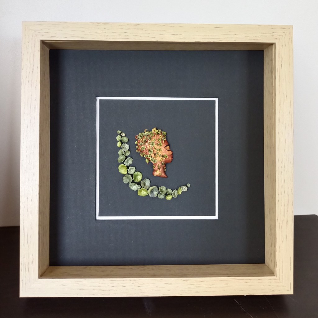 Le visage mesure 4 cm de large sur 6 cm de haut. L’œuvre finale est présentée dans un cadre vitrine 3D de 25x25cm.