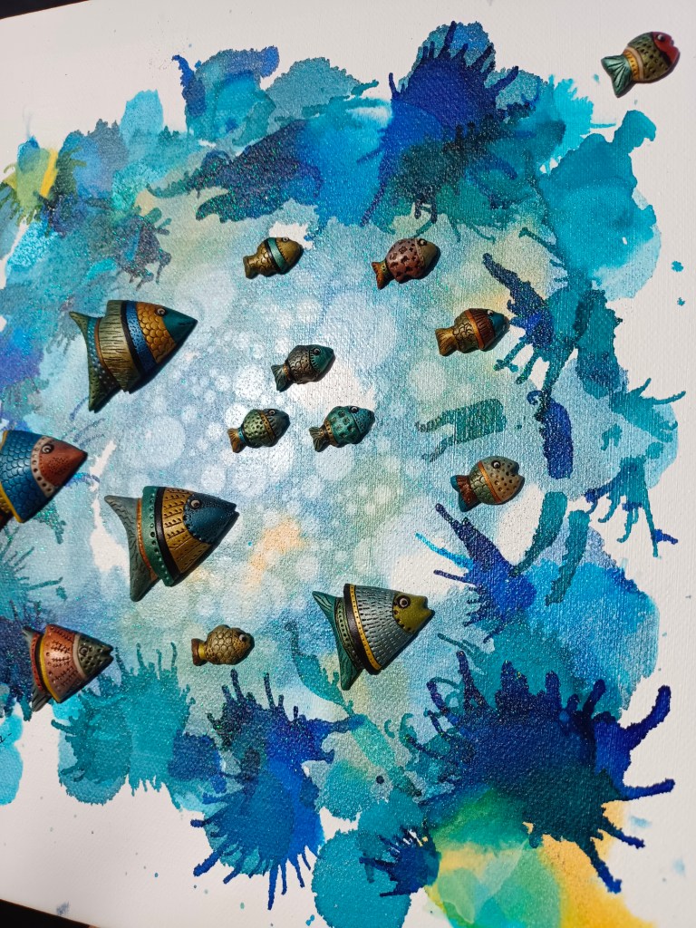 Poissons modelés selon technique de perle creuse, gravés, patinés, mis en scène sur fonds peint (acrylique, encres d’alcool) – Toile sur chassis 30*30cm